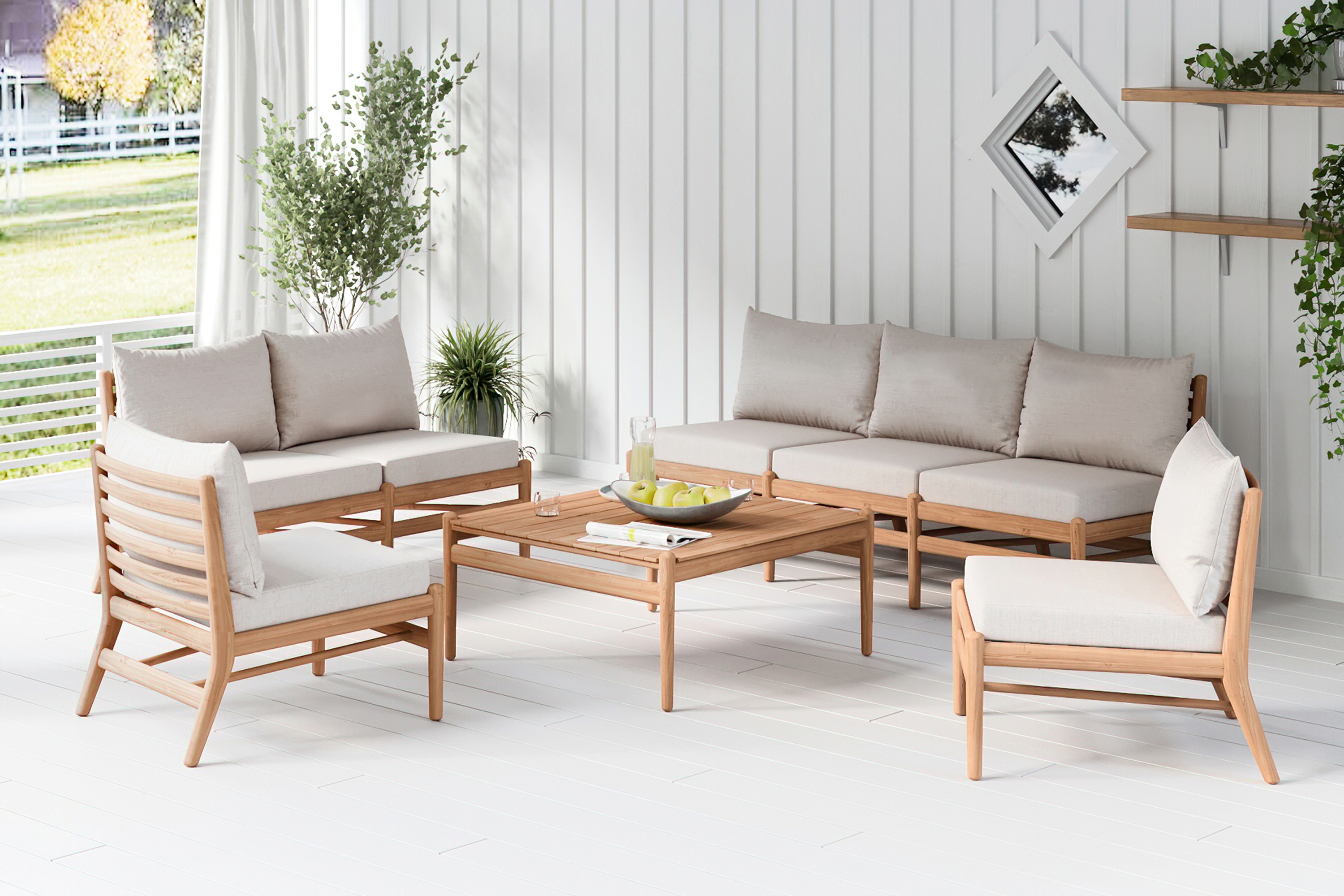 Sittmöblerna kompletteras av bekväma dynor i en naturnära beige nyans som passar perfekt ihop med teakstommen. Teak är ett hållbart material med ett tidlöst uttryck som får en fin patina/silvergrå färg med tiden. Vill du däremot behålla dess mörkare utseende bör du då och då olja in det med en passande olja. Du rekommenderas också att täcka över eller ställa in dina utemöbler när de inte används. På så sätt kommer du att kunna njuta av din bekväma och vackra Hamptons-grupp så länge som möjligt!