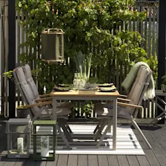 Storleken på din uteplats styr vilka utemöbler du har möjlighet att välja mellan, men det finns många snygga och praktiska matgrupper som passar just för dig med en mindre uteplats eller en balkong. Rektangulära bord är mindre skrymmande, och det kan vara bra att välja hopfällbara stolar som går enkelt att ställa undan när de inte används. Det finns också mindre matbord som går att fälla ihop.