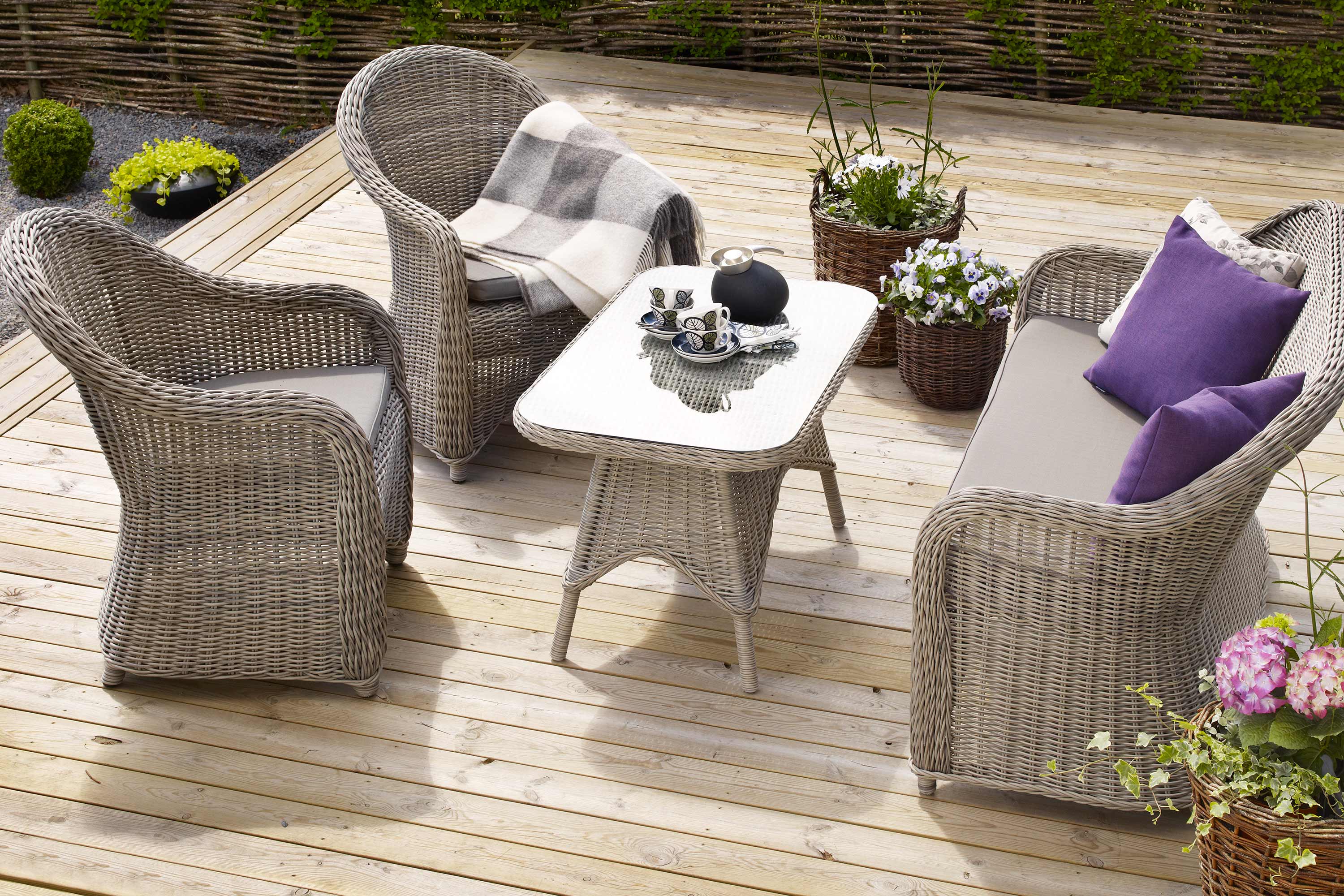 Paulina-serien består av utemöbler tillverkade i konstrotting på aluminiumstomme, som gör dem mycket vädertåliga. Möblerna i denna klassiska serie består av flera tänkbara kombinationer för att uppfylla era önskemål och behov. Välj soffa, ett par fåtöljer och ett rektangulärt bord för sköna lata stunder på altanen. Om ni föredrar de mjuka formerna av ett runt bord finns det också i serien. Ibland kan det kännas lättare att samlas fler personer vid ett runt bord och flera fåtöljer. De är mycket komfortabla att sitta i vare sig ni vill ha en skön kaffestund ute i trädgården eller njuta av ett glas vin på verandan. Möbelserien Paulina från Brafab gör sommaren lite skönare.