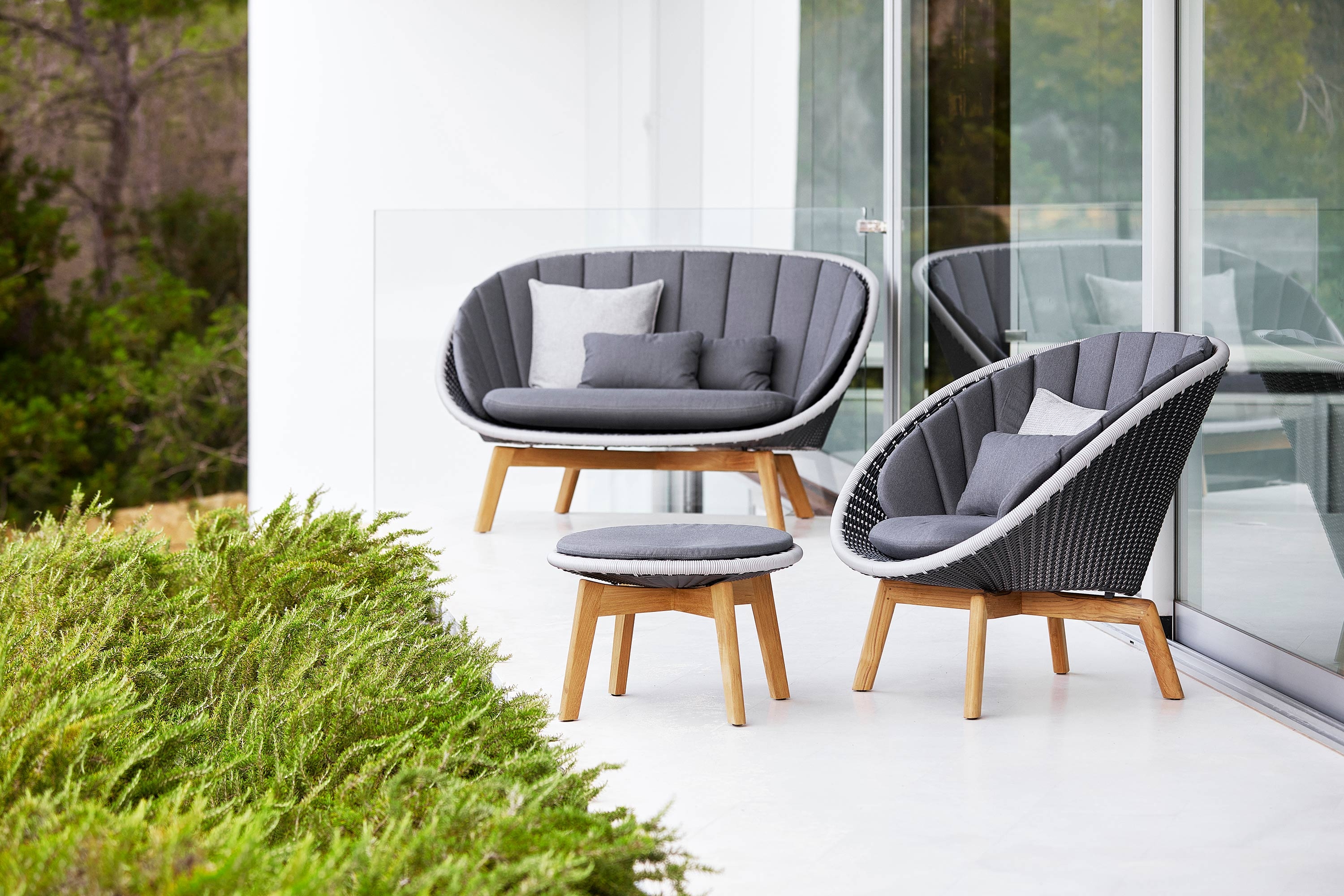 Peacock är en serie loungemöbler för utomhusbruk från den danska tillverkaren Cane-line. Deras ståtliga rundade former påminner lite om en påfågels utspända fjädrar och kommer få dem att nästan likna skulpturer ute på altanen eller gräsmattan. Utöver att vara visuellt vackra så erbjuder möblerna en mycket hög komfort som bjuder in till härliga stunder med familj och vänner.